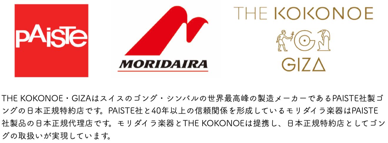 PAISTE社の製品の日本正規総代理店である株式会社モリダイラ楽器とTHE KOKONOE・GIZAは提携し、日本正規特約店としてゴングのご紹介・取扱いを行っています。