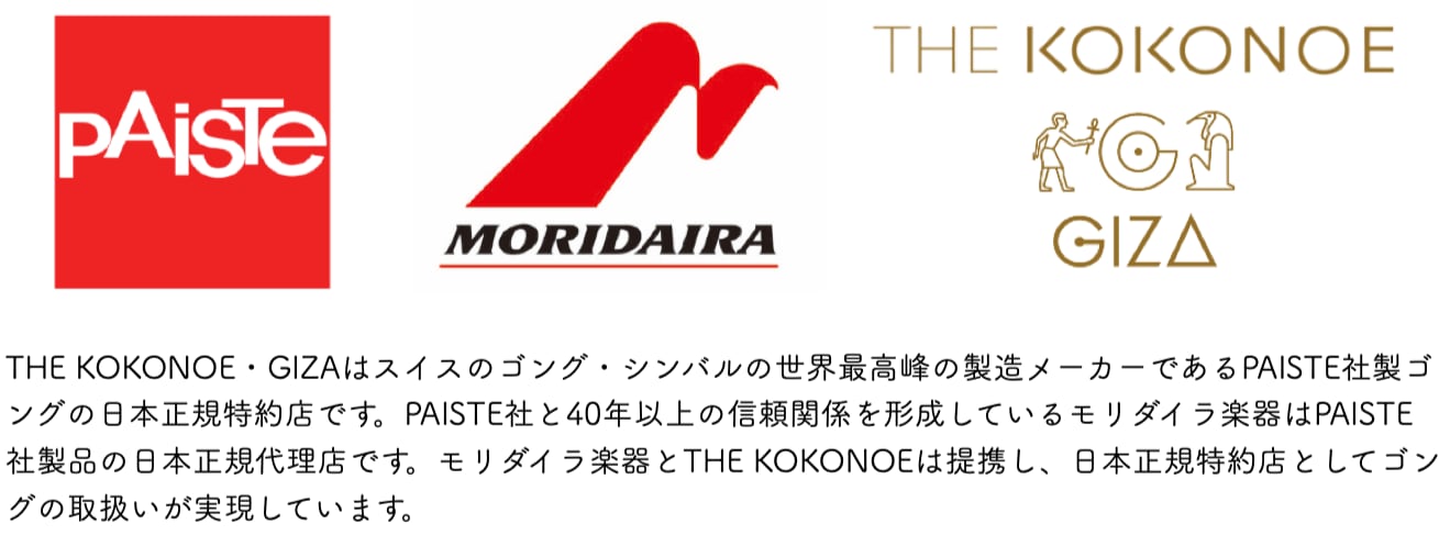 PAISTE社の製品の日本正規総代理店である株式会社モリダイラ楽器とTHE KOKONOE・GIZAは提携し、日本正規特約店としてゴングのご紹介・取扱いを行っています。